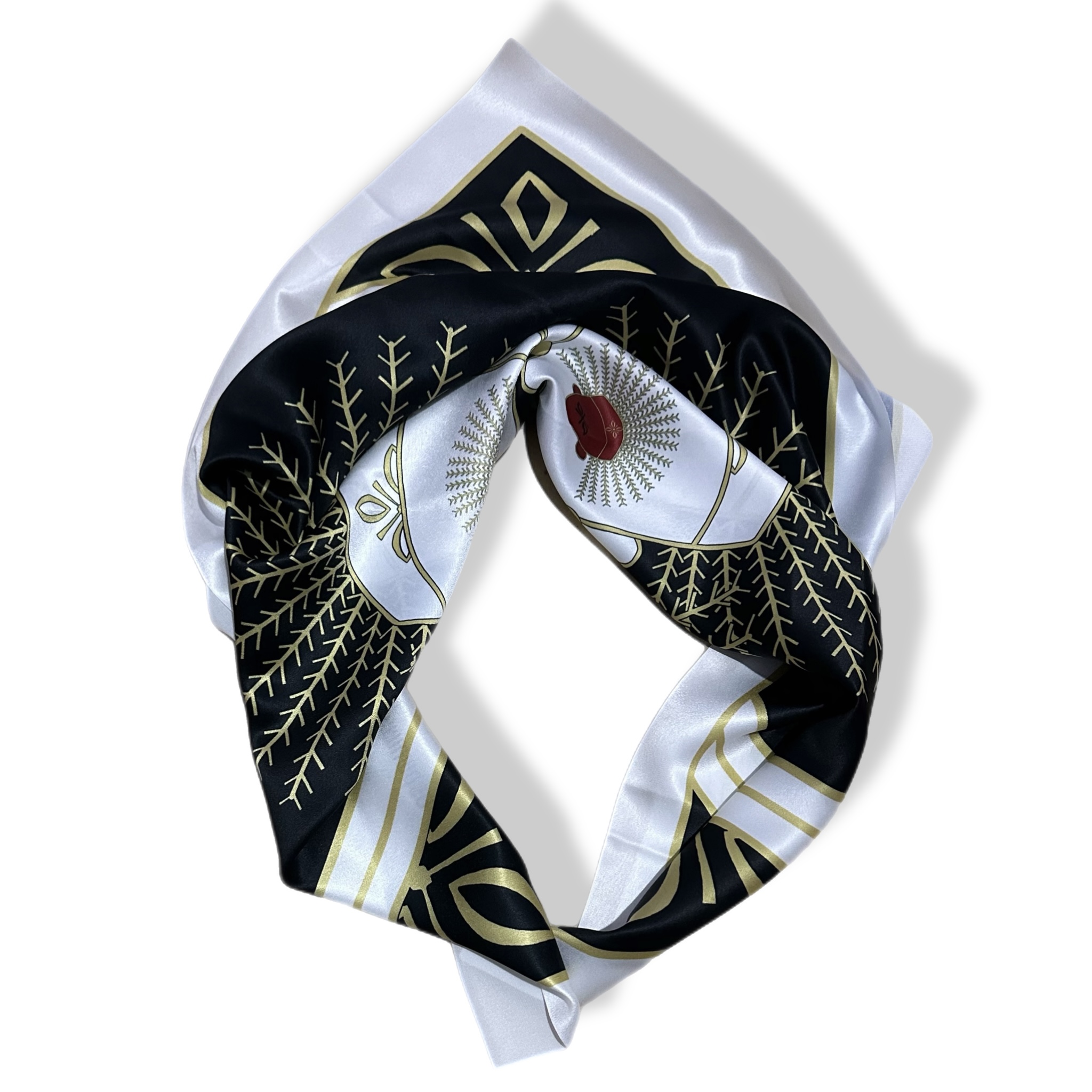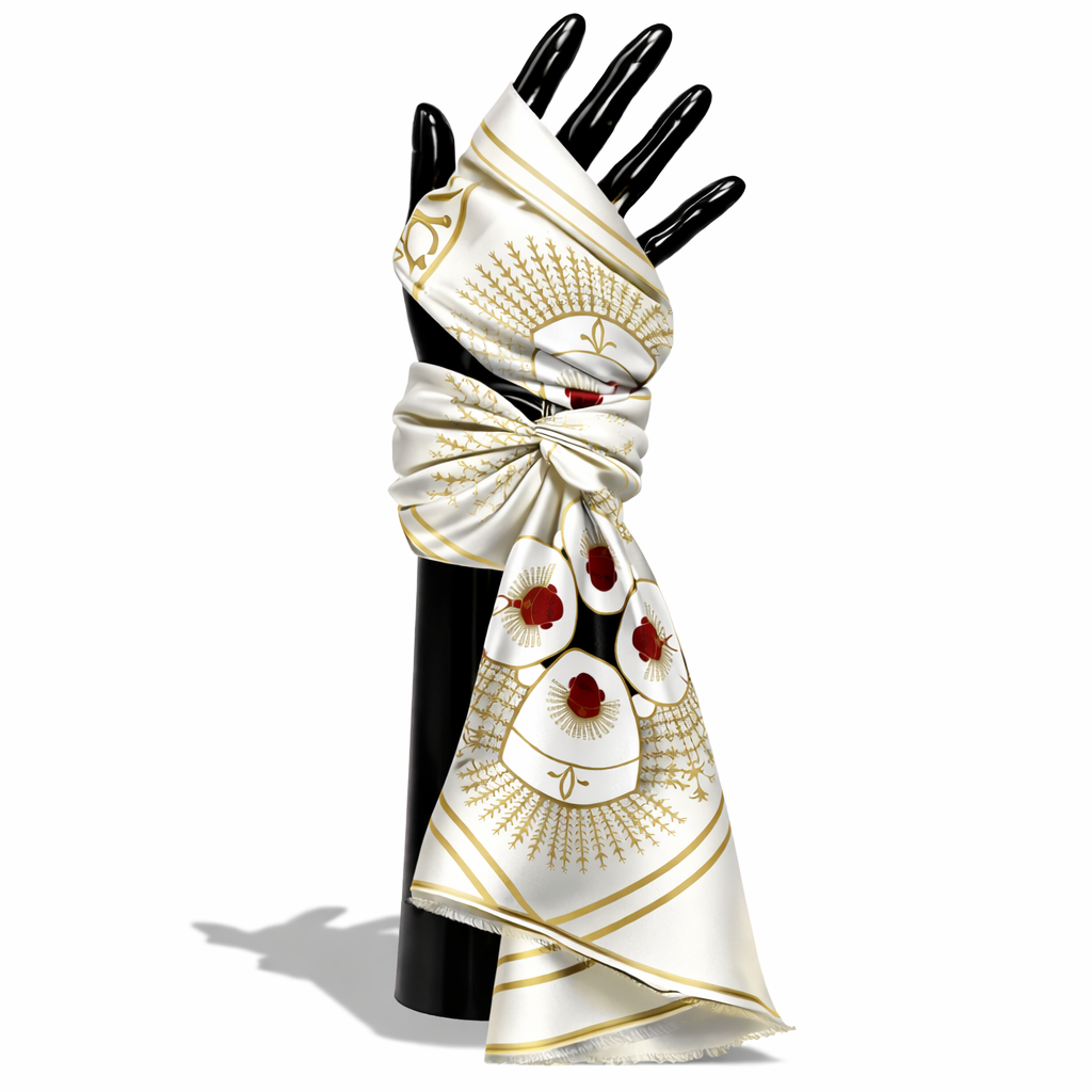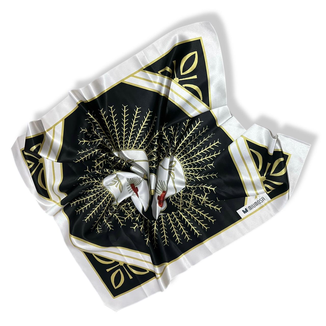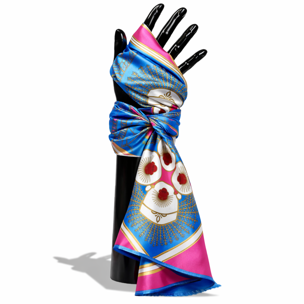 Budaya Silk Scarf Series. 498 Jakarta Edition. Jakarta is a city where history and culture pulse beneath the surface of its modern skyline, with the iconic Monas standing tall as a symbol of national pride and resilience. Beneath the golden flame, the intricate art of kembang kelapa adorns traditional celebrations—its blooming form a symbol of hope and enduring spirit. On the streets, a pair of Ondel-ondel dances to the rhythm of tanjidor music, echoing the spirit of ancient guardians in a vibrant, living tradition. Budaya Silk Scarf is an exclusive series that celebrates the spirit of Indonesia’s 38 provinces, with each design telling a unique story — a visual symphony of culture, identity, and enduring beauty. Satin Silk 70 x 70 cm