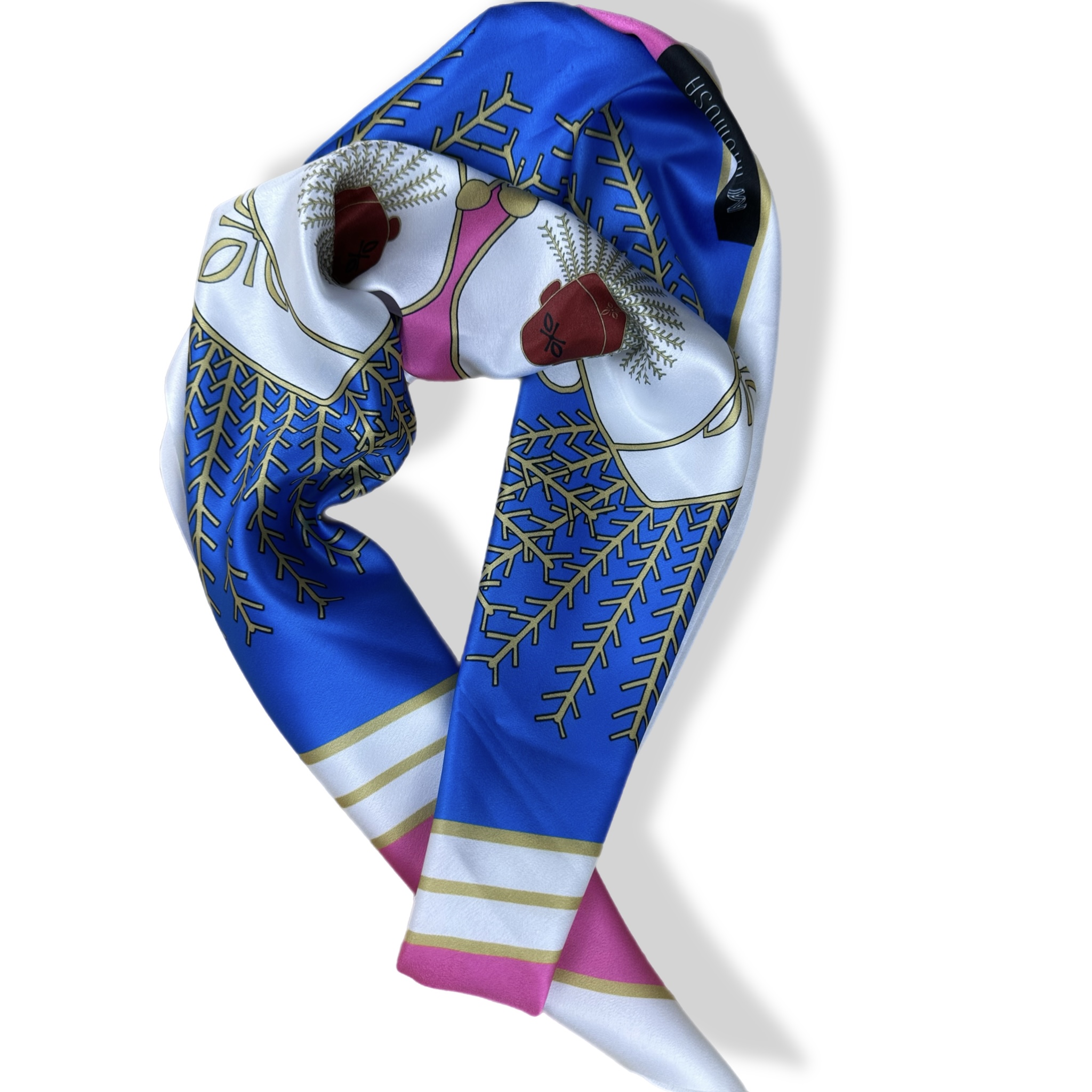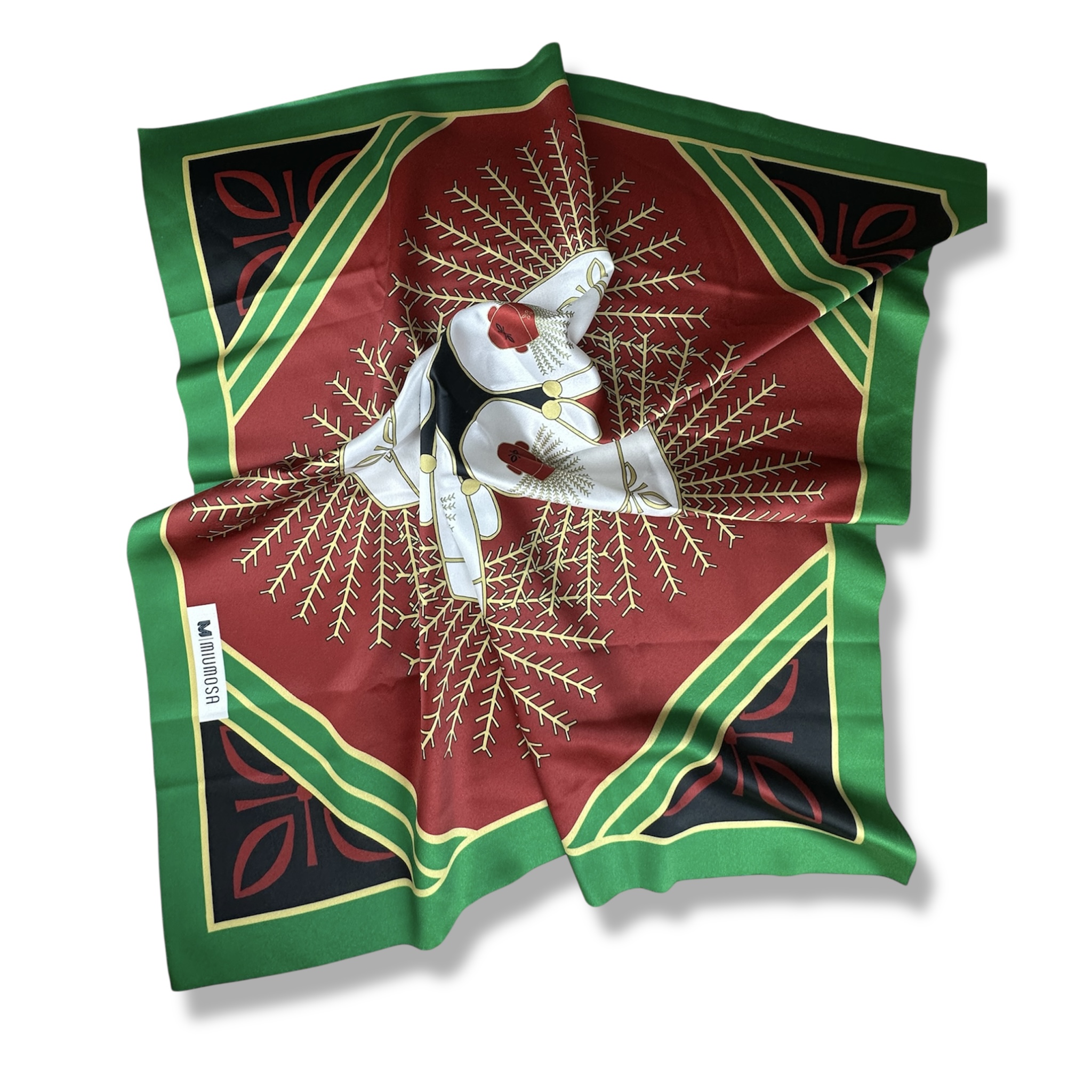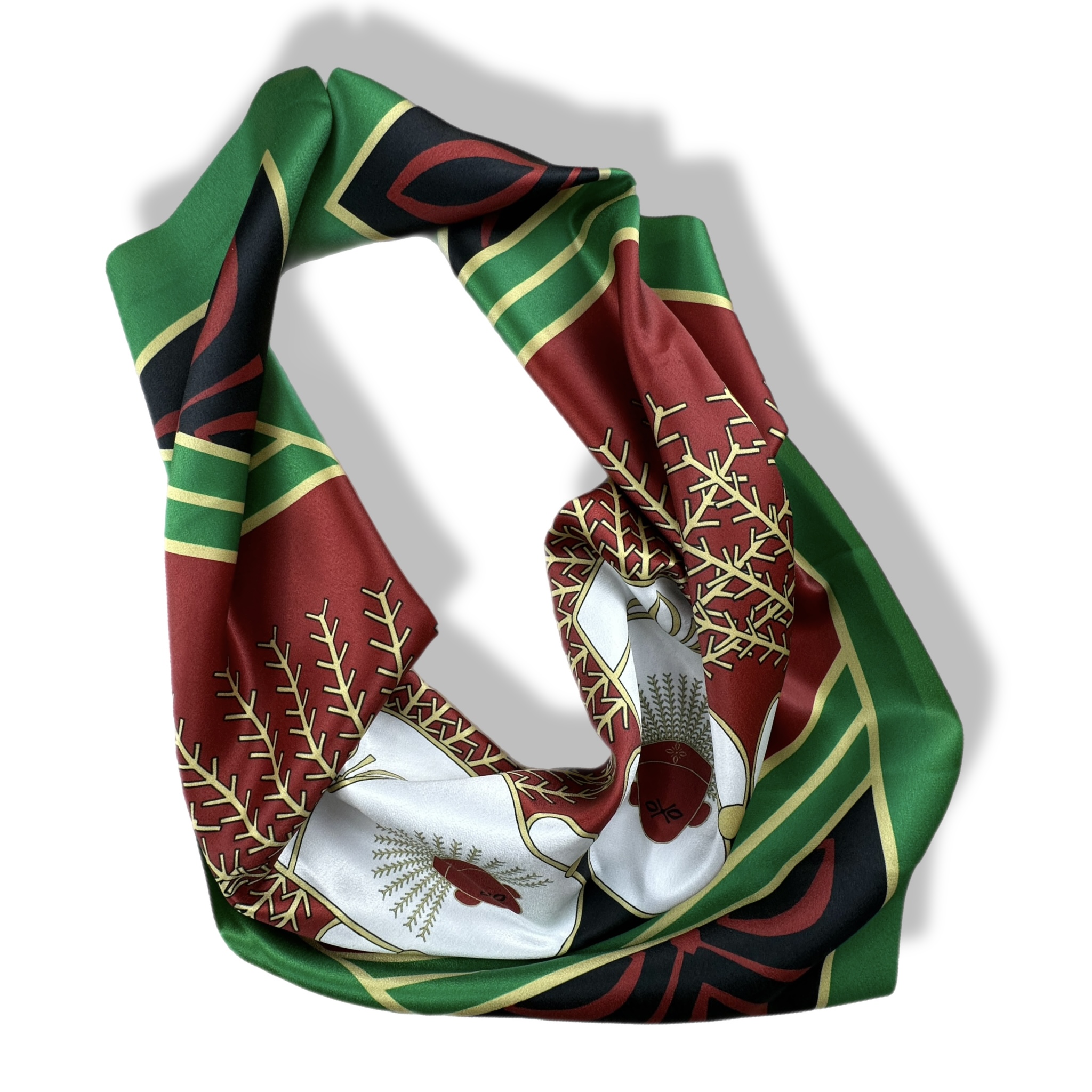 Budaya Silk Scarf Series. 498 Jakarta Edition. Jakarta is a city where history and culture pulse beneath the surface of its modern skyline, with the iconic Monas standing tall as a symbol of national pride and resilience. Beneath the golden flame, the intricate art of kembang kelapa adorns traditional celebrations—its blooming form a symbol of hope and enduring spirit. On the streets, a pair of Ondel-ondel dances to the rhythm of tanjidor music, echoing the spirit of ancient guardians in a vibrant, living tradition. Budaya Silk Scarf is an exclusive series that celebrates the spirit of Indonesia’s 38 provinces, with each design telling a unique story — a visual symphony of culture, identity, and enduring beauty. Satin Silk 70 x 70 cm