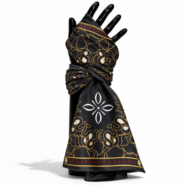 Silk Scarf, 70 x 70 cm | Executed in an original palette of Black, Grey, White, and Gold—each hue carrying symbolic resonance within the Cikaputrian cosmology.