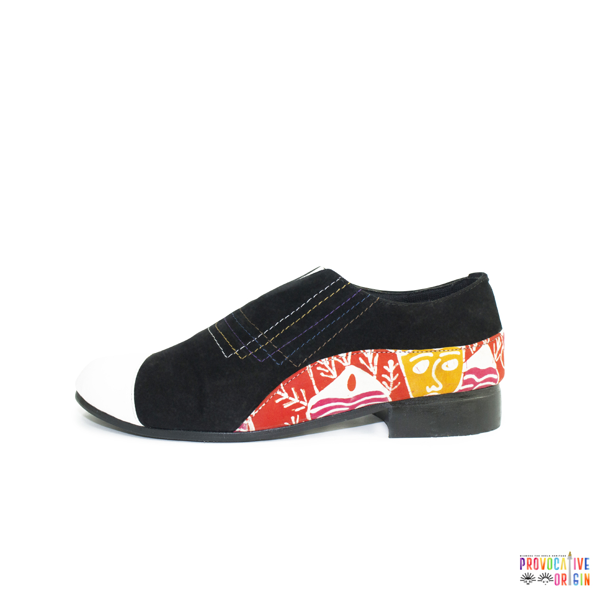 Official Shoe for Abang None Jakarta-Kepulauan Seribu 2019. Story of. Dododio, Mak Ronda, Rasamala, Nusa Kalapa, Lereng, Ondel-Ondel, Pesalo, Salakanagara, Albetawi, Kodangdia, Langgara, Warakas, flora fauna asli Betawi, Daun Tarum, Nderep, Kampung Marunda, Ngeluku (Bajak Sawah), Ngelancong/Bedemenan, Nandur, Burung Hong, Numbuk Padi, Baritan, Sulur Jawara, Ronggeng Uribang, Galur Ondel-Ondel, Kuntul Blekok, Payung Cokek, Ulung-Ulung, Bondol Biru are just a name of few of batik Betawi motifs which aims to balance a prosperous life and having blessed by God merci. Details: Upper: Batik Betawi motif; black patented suede and white leather. Rainbow stitching trademark. Lining: Soft leather Sole: cow leather. Made in Indonesia