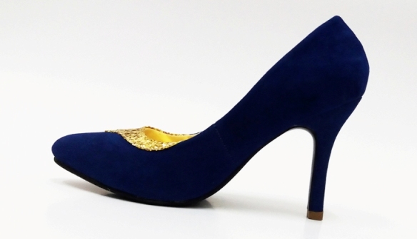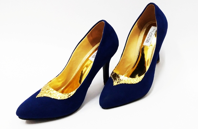 Classic Pump. Dark Blue suede featuring gold knitted-beads embellished. Upper: Dark Blue. Gold knitted- beads. Lining: suede Sole: Leather Heel measures 90mm Made in Indonesia