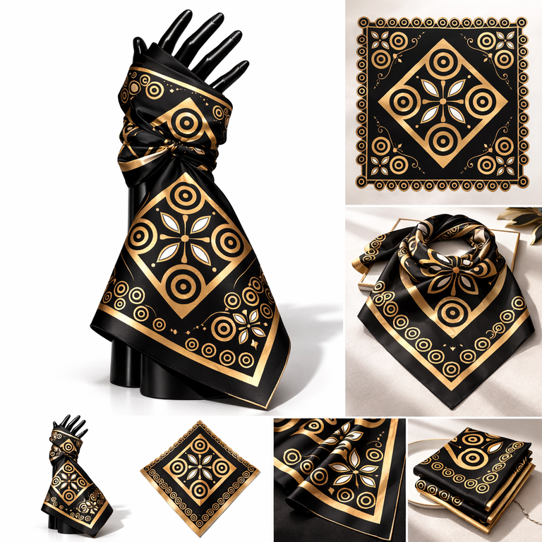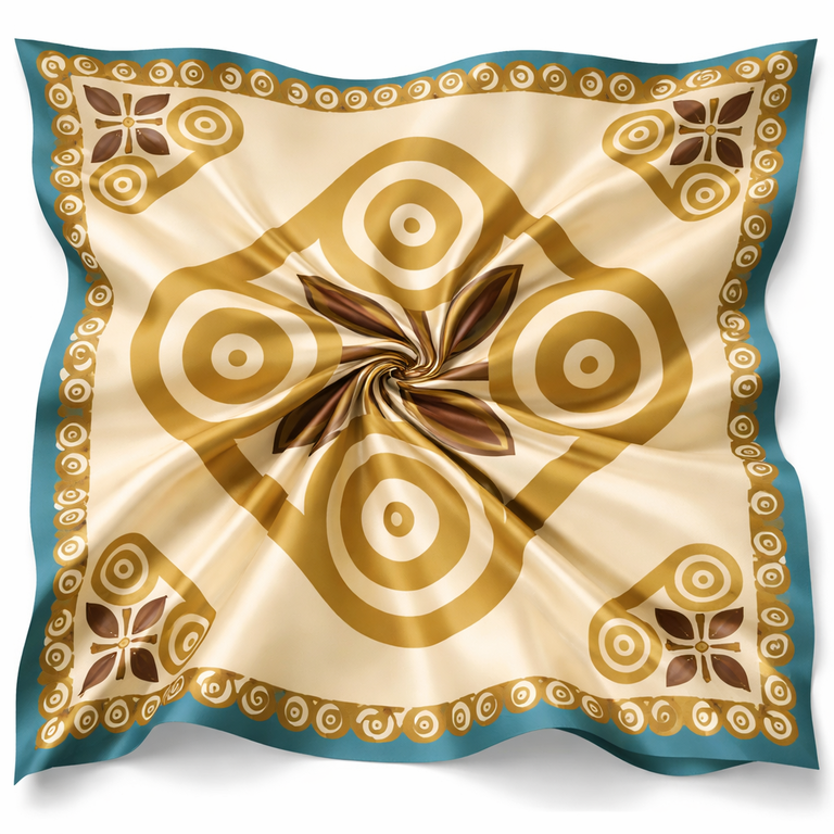 Conceived as a portable vessel of that interior gold, the scarf translates mythology into surface and movement. Spiraling motifs echo the geometry of the shell, while restrained lines of gold articulate permanence without excess. Silk becomes both medium and metaphor — supple yet tensile, luminous yet composed — allowing concealment and revelation to coexist with each fold. Here, adornment is not embellishment but essence made tactile: a quiet sovereignty carried close to the body.