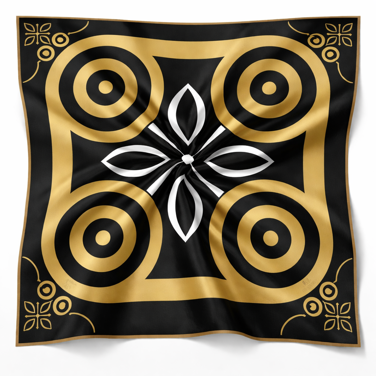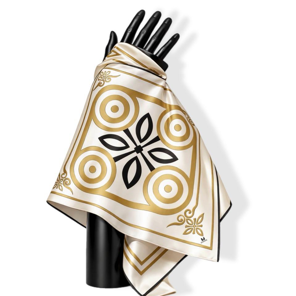 Conceived as a portable vessel of that interior gold, the scarf translates mythology into surface and movement. Spiraling motifs echo the geometry of the shell, while restrained lines of gold articulate permanence without excess. Silk becomes both medium and metaphor — supple yet tensile, luminous yet composed — allowing concealment and revelation to coexist with each fold. Here, adornment is not embellishment but essence made tactile: a quiet sovereignty carried close to the body.