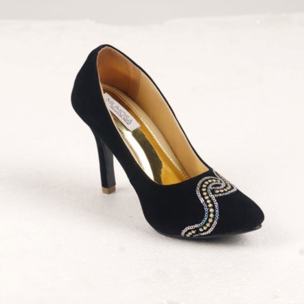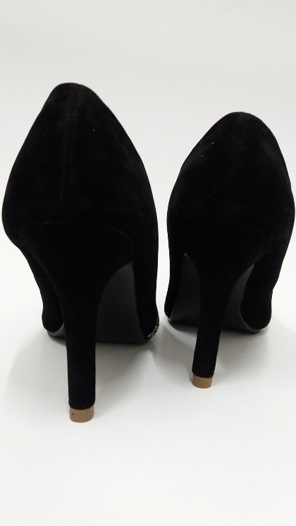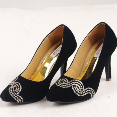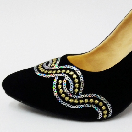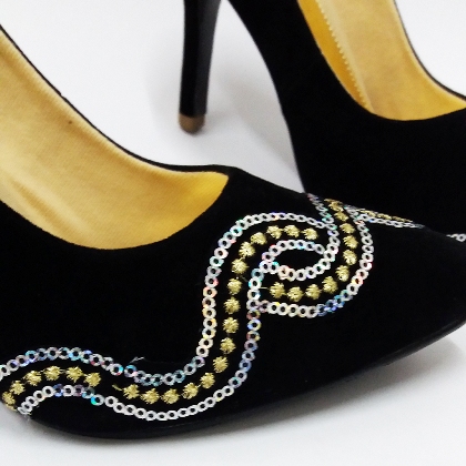 Embroidery pump shoes. Upper: Black Suede Sole: leather. Lining: suede Heel measures 80mm Made in Indonesia